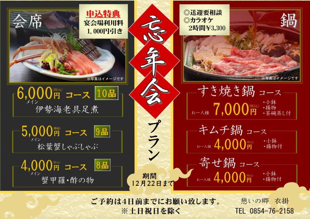 令和7年も残すところ11月、12月と2か月になりました。忘年会プランをご用意致しましたので是非ご利用下さい